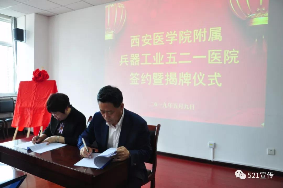 5月9日,兵器工业521医院举行“西安医学院非直属附属兵器工业五二一医院”签约暨揭牌仪式,521医院副院长滕云升、副院长张朝、各职能处室负责人及临床科主任代表参加。西安医学院教学主管院长李雪萍、实践教学处处长李俊杰等领导专家出席了签约揭牌仪式,揭牌仪式由张朝主持。