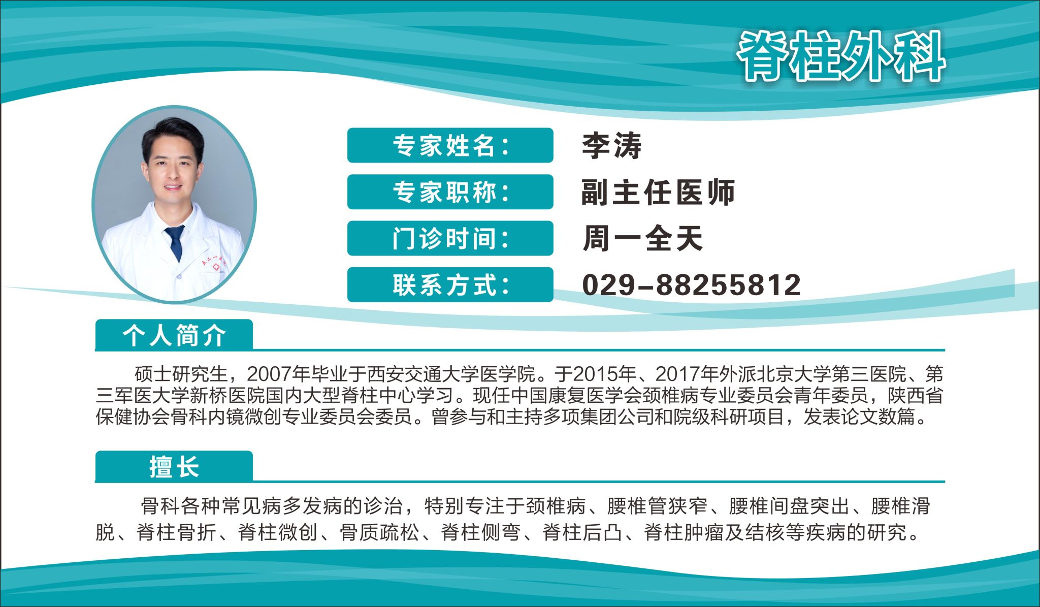 李涛,男,副主任医师,西安交通大学医学院在读博士;从事骨科临床、科研工作10余年,曾在北医三院骨科进修学习;现任中国康复医学会颈椎病专业委员会青年委员,陕西省保健协会骨科内镜微创专业委员会委员;获2015年兵器工业集团科技进步三等奖1次;发表学术论文数篇。