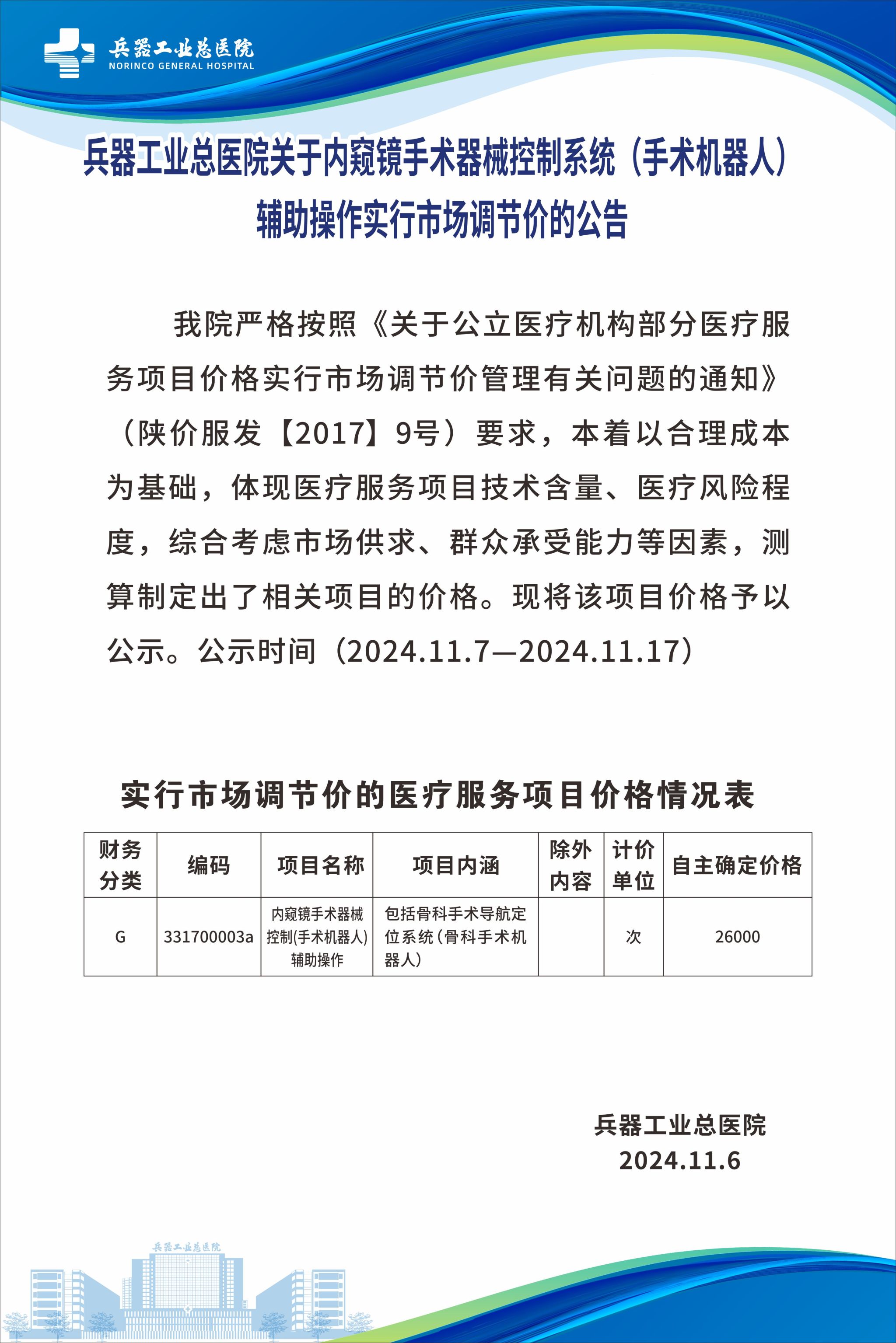 兵器工业总医院关于内窥镜手术器械控制系统(手术机器人)辅助操作实行市场调节价的公告