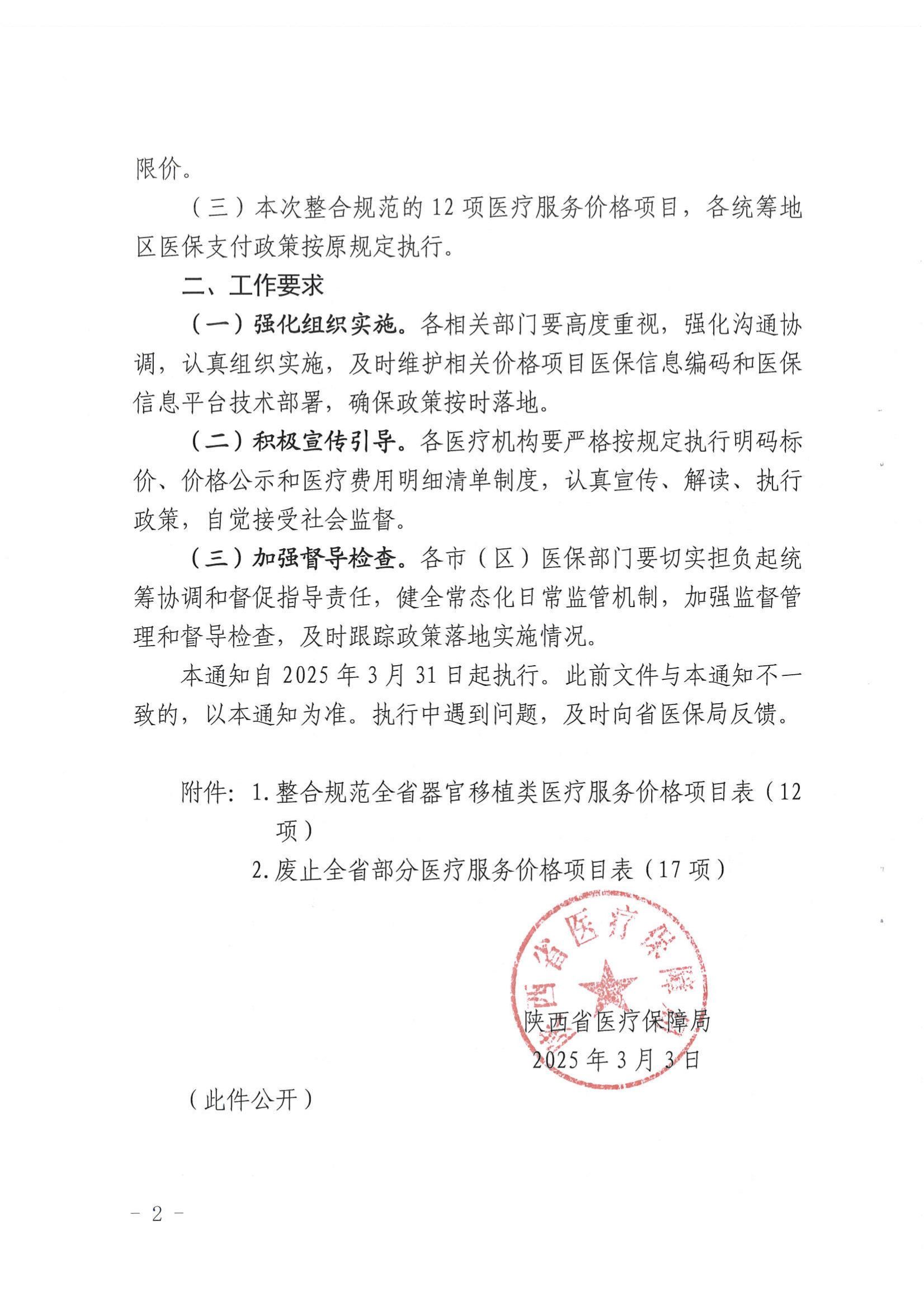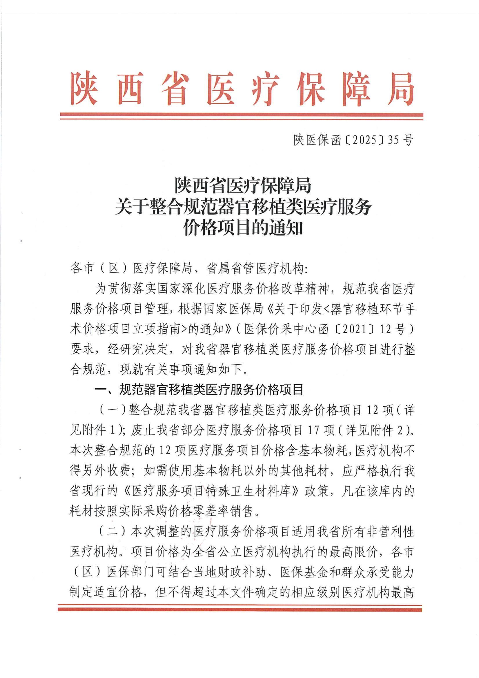 陕西省医疗保障局关于整合规范器官移植类医疗服务价格项目的通知